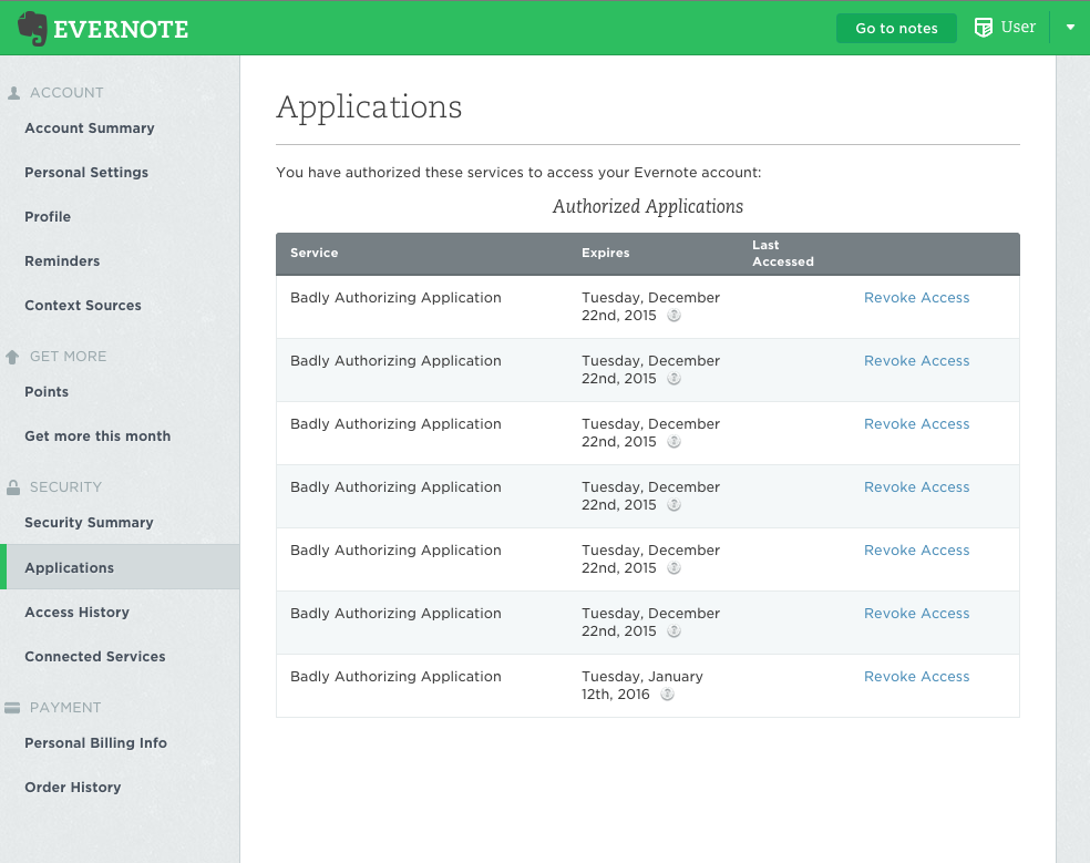 Access tokens are issued by the Evernote API at the end of the OAuth authentication flow. For most Evernote integrations, these tokens will expire after one year. The authorizing user also has the option to choose a shorter duration (one day, one week or one month) and revoke access tokens associated with a given integration. In any case, it’s important to build integrations that can react elegantly to access tokens that have been revoked or expired.